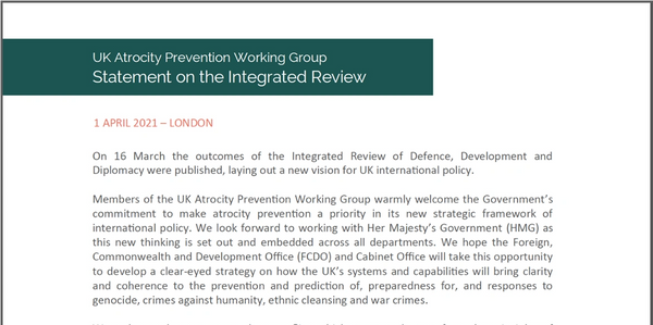 On 16 March 2021 the outcomes of the Integrated Review of Defence, Development and Diplomacy were published, laying out a new vision for UK international policy. Members of the UK Atrocity Prevention Working Group have released a statement responding to this new vision.