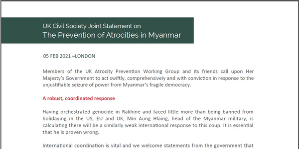 Members of the UK Atrocity Prevention Working Group and friends released a joint statement on the prevention of mass atrocities in Myanmar. The statement calls upon Her Majesty’s Government to act swiftly, comprehensively and with conviction in response to the unjustifiable seizure of power from Myanmar’s fragile democracy.