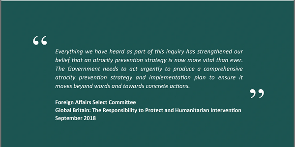 Members of the working group sent an open letter to all political party leaders ahead of the General Election on 12th December 2019 asking them to set out their commitments on atrocity prevention. For the first time, all major political parties committed to prioritising atrocity prevention during the next parliament, and to working across party in doing so. You can read the letter and replies at the links below.